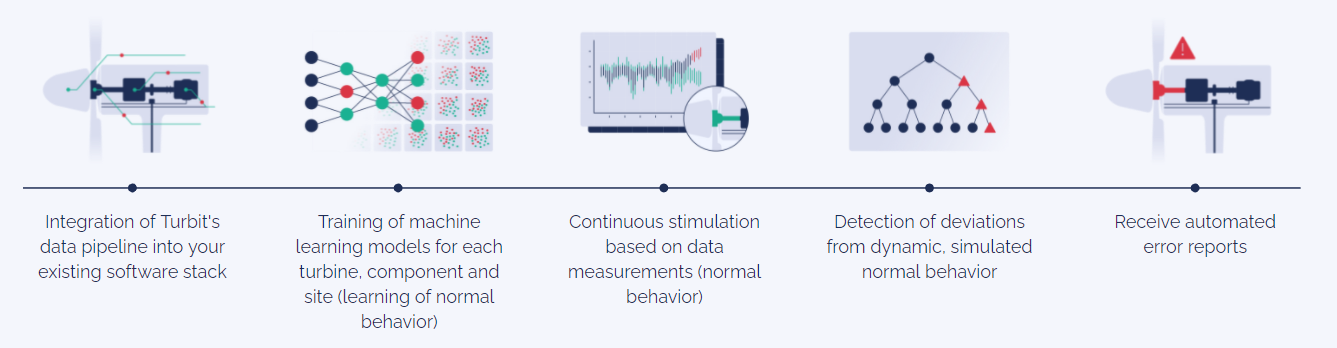 Neural networks learn each WTG behavior individually over the course of the year and determine what normal behavior looks like. They then match data measurements with predicted behavior. Detection algorithms can thus find anomalies - i.e. deviations between real and simulated behavior - at an early stage, enabling rapid action and preventing major incident to the main components.